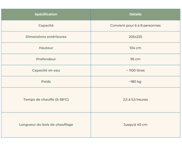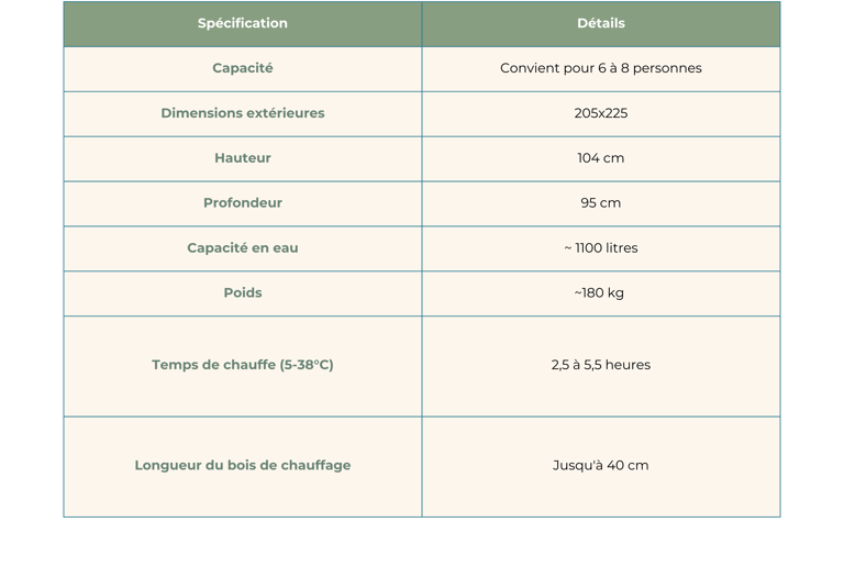 Découvrez le mélange parfait de luxe et de praticité avec ce bain nordique de taille L, conçu pour accueillir 6 à 8 personnes. Cette baignoire nordique offre un intérieur spacieux avec un insert en fibre de verre profond et confortable et un revêtement thermo-traité sophistiqué, alliant harmonieusement charme esthétique et fonctionnalité exceptionnelle.