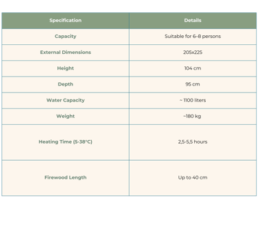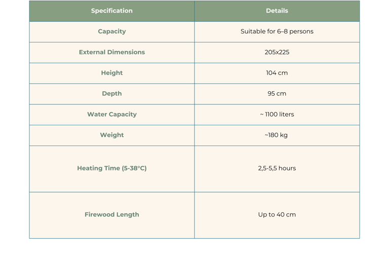 What sets this hot tub apart is its smartly integrated heater, positioned under the seating area. This thoughtful placement not only saves space but also ensures complete safety by preventing accidental burns. The heater includes a stylish glass door, doubling as a cosy outdoor fireplace to enhance your backyard ambience while the water heats.